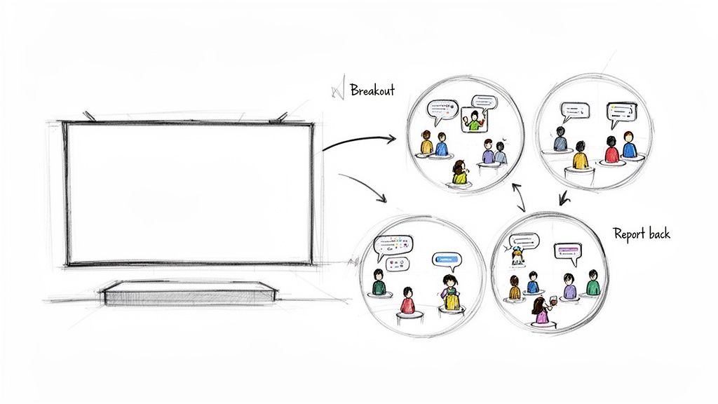 Breakout rooms transform a one-to-many broadcast into a collaborative workshop by dividing your audience into smaller, focused groups. This is one of the most powerful interactive webinar ideas for fostering genuine peer-to-peer learning and deeper engagement. Instead of just listening, attendees actively discuss specific topics, use cases, or challenges, creating a stronger sense of community and shared discovery.